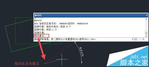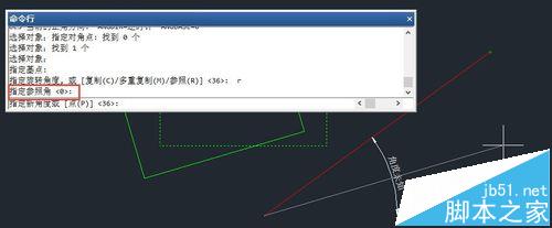 3、輸入R回車,軟件會提示輸入參照角,默認角度為0,也就是水平方向,因為矩形是水平的,我們可以直接回車,軟件會提示輸入新角度,如下圖所示。
