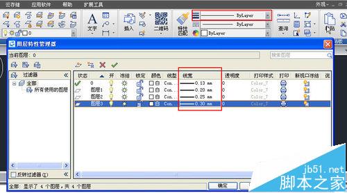1、直接給圖層設(shè)置線寬,對象的線寬設(shè)置成BYLAYER,很多機械圖里圖層比較少,主要是按線型、線寬區(qū)分圖層,通常采用這種方式。如下圖所示。