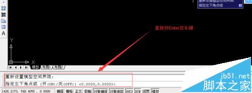 2、這時命令欄里會出現(xiàn)重新設(shè)置模型空間界限的說明,在下面的原坐標(biāo)為(0.000,0.000)。看到這里我們直接按回車鍵就好。
