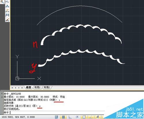 4、對象:點擊云線命令后,輸入O回車,點擊圖上的一條弧線,然后弧線會變成云線,這時不輸入默認不反向,輸入Y回車得到的是反向的云線。