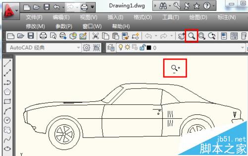 1、點擊選擇cad實時縮放工具,按住鼠標向上拖就會使cad圖形放大,向下拖就會使cad圖形縮小。