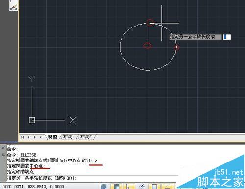 3、在點(diǎn)擊橢圓命令后,輸入欄出現(xiàn):指定橢圓的軸端點(diǎn)或[圓弧(A)/中心點(diǎn)(C)]:這里講解一下中心點(diǎn)繪制。點(diǎn)擊橢圓命令,輸入C回車,繪圖區(qū)點(diǎn)擊一點(diǎn),點(diǎn)擊長軸的另一端點(diǎn),移動(dòng)鼠標(biāo)點(diǎn)擊短軸端點(diǎn)得到橢圓。