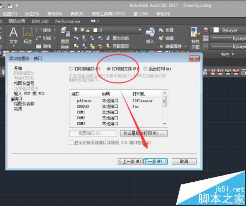 7、選“打印到文件”[這一步很重要,它決定著你能不能打PS文檔],然后下一步;