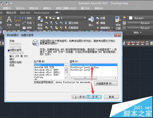 5、設(shè)備選Adobe公司的Postscript Level 1(默認(rèn)的第一個(gè))然后下一步;
