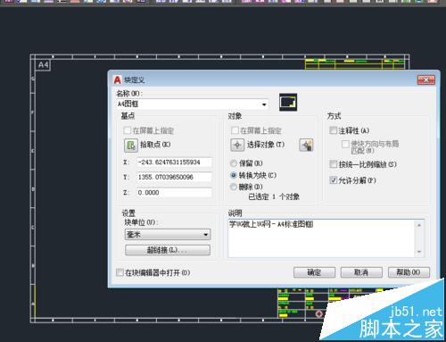 3、定義塊可以輸入快捷鍵B;在給塊指定名稱后,選擇基準點;為所創建的塊選擇對象,(這里可以框選圖框)在選擇完成后點保存;