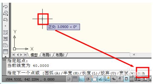 3、首先點擊鼠標指定第一點,然后在cad命令行中輸入h按回車鍵,設置多段線端點半寬。也可以輸入w設置多段線寬度,半寬即寬度的一半。