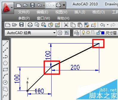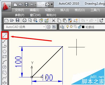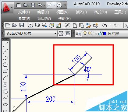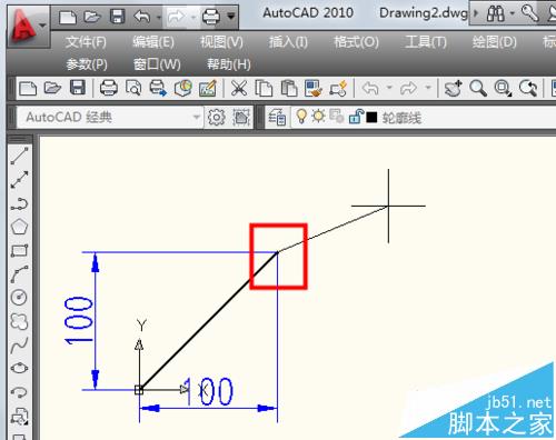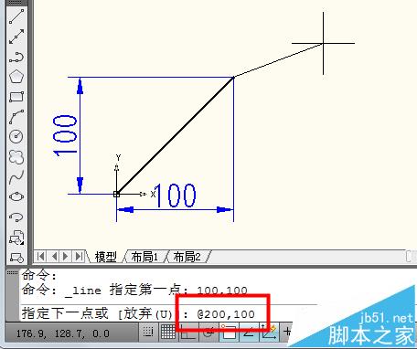 3、相對坐標還有一種畫角度的方法,如果輸入"@100<45"。