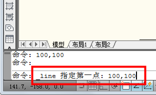 4、此時cad直線的第一點就定位在絕對坐標“100,100”處了。
