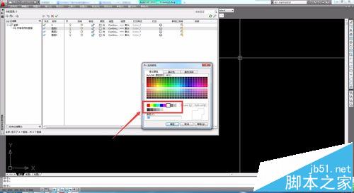 2、點擊圖層屬性中的“顏色”,(新建圖層的默認顏色為白色或新建圖層之上的那個圖層的顏色)。給每個圖層賦予一個自己喜歡的顏色。紅框范圍內的顏色是cad默認的基本原色。