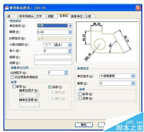 4、進(jìn)入“修改標(biāo)注樣式:ISO-25”對(duì)話(huà)框,對(duì)話(huà)框中選擇“主單位”選項(xiàng)。在“測(cè)量單位比例”里面修改比例因子【把2改為1】。點(diǎn)擊“確認(rèn)”,返回“標(biāo)注樣式編輯器”對(duì)話(huà)框,再點(diǎn)擊“置為當(dāng)前(U)”,選擇“關(guān)閉”即可。