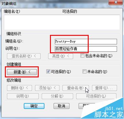 3、在cad對象編組中輸入編組名和說明,然后點擊新建。
