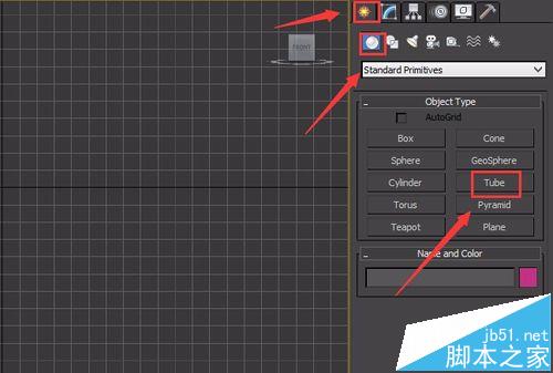 3、點擊tube命令在前視圖點擊鼠標左鍵,并拖動創建一個tube物體,如圖所示: