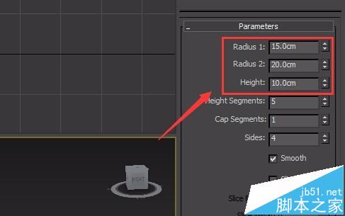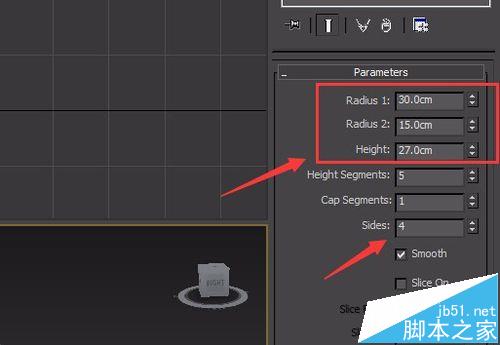 4、在右側找到modify選項,將這個物體命名為外殼,并修改radius1,radius2,height,sides的值分別為30,24,5,4,并勾選smooth前的單選按鈕,如圖所示: