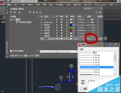 8、最后,就是對線寬的修改了。圖層新建的時候都是默認(rèn)線寬,在進(jìn)行工程圖設(shè)計(jì)的時候就必須對其線寬進(jìn)行相應(yīng)的修改,如圖所示,鼠標(biāo)左鍵點(diǎn)擊紅線部分就可以選擇想要的線寬,然后點(diǎn)擊“確定”即可。這樣,一個圖層就建立好了,同理可以建立其他圖層。