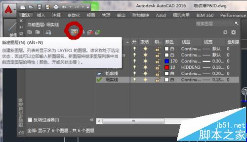 3、打開“圖層特性”,彈出如圖所示對話框,大家可以看到,這里面有我已經(jīng)建立好的6個圖層,每一個圖層都可以選擇不同的線條顏色、線型和線寬。如果要建立新圖層,則可以鼠標(biāo)左鍵點(diǎn)擊如圖紅線部分“新建圖層”來建立新的圖層。