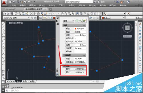 7、在特性列表中,可以直接看出面域的面積大小,周長長度等特性了。也可以點擊“工具”——“查詢”——“面積”中進行查看。