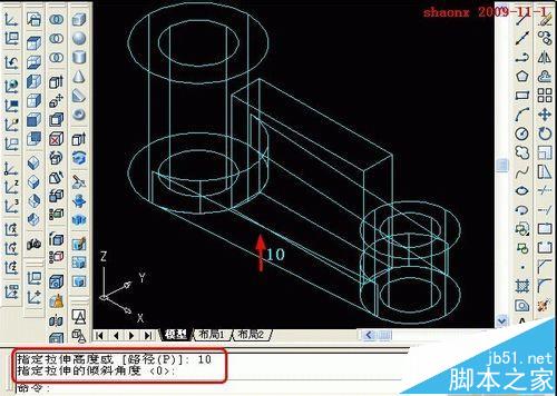7、點擊“拉伸”命令按鈕,最后再對中間的特殊型面域進行拉伸,高度為10,傾斜度等于0。