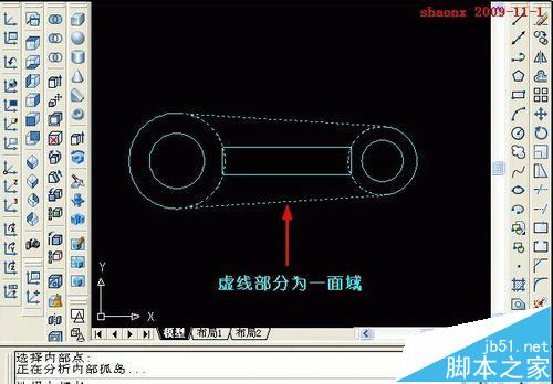 3、平面部分畫好后,做成面域,除了四個圓和中間的矩形外,還有一個部分比較特別,請看下圖的虛線部分。共需做成六個面域。