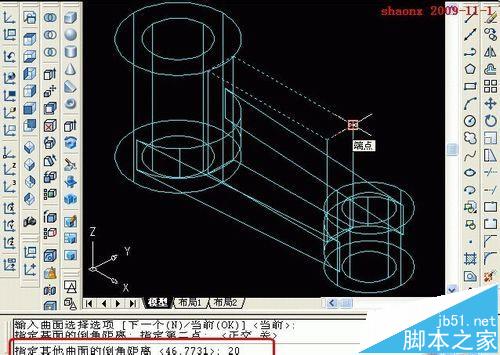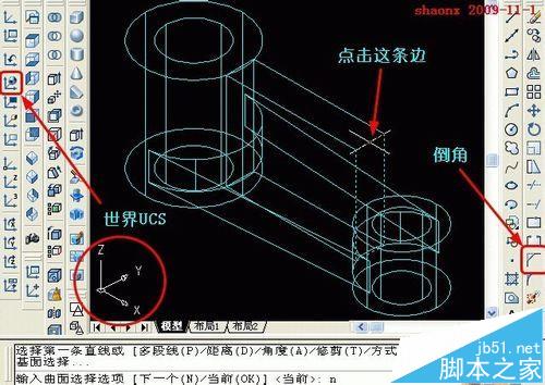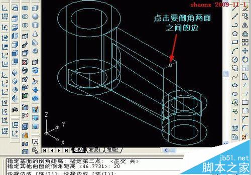 13、輸入完兩面的倒角距離后,按提示選擇要倒角兩個面之間的邊,回車確認,即倒角操作完畢。