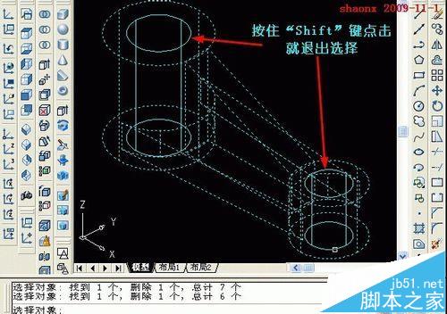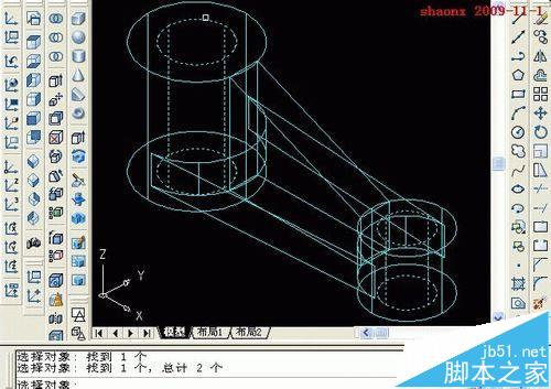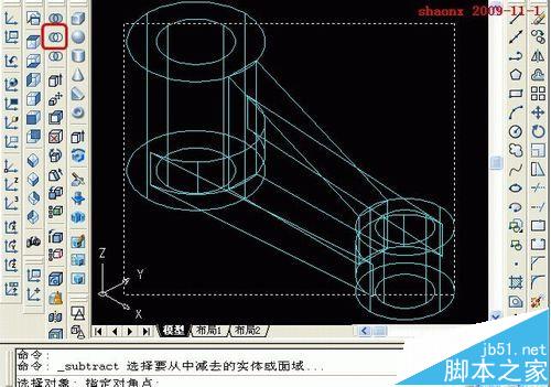 16、回車后,全部返回到實線狀,在點擊要減去實體的部分,即兩端中間的小圓柱體。回車確認后,差集操作完畢。