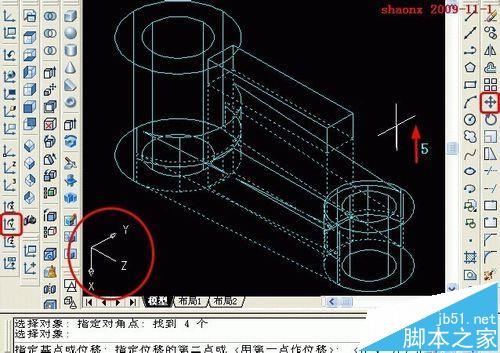 8、全部拉伸操作完成后,對中間的兩個實體往上移動5。點擊UCS工具條中的“Y軸旋轉”,并輸入旋轉值90度。注意看一些UCS坐標,原來的Z軸方向,變成了X軸方向,中間的兩個實體就可以沿現在的X軸進行上下移動了。點擊“移動”命令按鈕后,現在中間的兩個實體,往上移動5。
