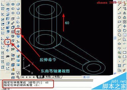 4、點擊“東南等軸測視圖”按鈕,轉到東南視圖。并點擊“拉伸”命令按鈕,對左邊的2個圓進行拉伸,高度為40,傾斜度等于0。