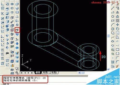 5、點擊“拉伸”命令按鈕,再對右邊的2個圓進行拉伸,高度為20,傾斜度等于0。