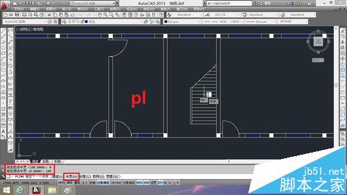 2、輸入pl, 然后指定起點,我這里放在階梯中點!然后輸入h,再輸入起點半寬,由于是畫的箭頭,所以這里的起點半寬必須輸入0,確定后接著輸入端點半寬,我這里輸入的是100,你自己要多大就輸多大!