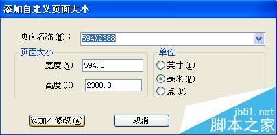 2、添加,輸入寬594 高2388 ,頁面名稱594x2388,單位 毫米,點 添加/修改
