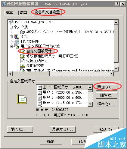 2、然后進入此界面內選擇第3項“設備和文檔設置”,在下面菜單中點擊“自定義圖紙尺寸”,在下面顯示的自定義圖紙尺寸中點擊“添加”選項。