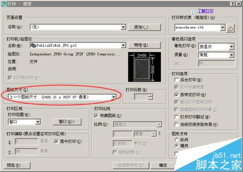 4、最后就是,在轉化為jpg圖片的時候,在“圖紙尺寸”選項中,點擊下拉按鈕找到前面設置保存好的像素名稱,再框選轉化內容就可以了。