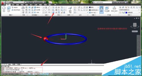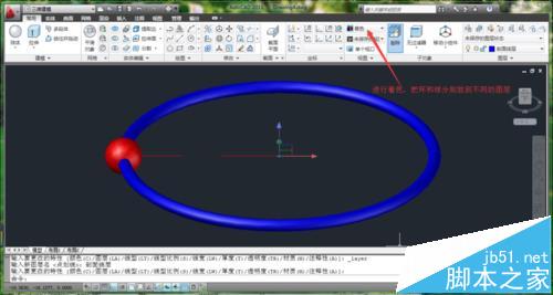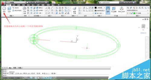 3、選擇實體圖元中的球體命令,選擇前面繪制的直線端點為中心,繪制一個半徑為3的球體,如圖所示。進行著色處理,分別把環和球放到不同的圖層,圖層設置請參考下面的經驗鏈接。