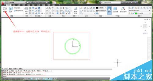 1、先將工作空間調整到三維建模,在實體圖元中選擇圓環體命令,選擇一個點為圓環體的中心,我這里指定的是0點,。選擇圓環體半徑和環的半徑,我這里分別指定的25和1.如圖所示