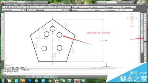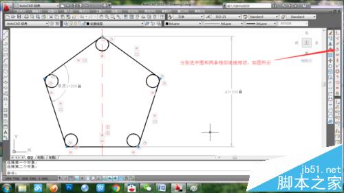 6、五個圓在角點處與相鄰兩直線相切,最后再次點擊幾何約束中的相切約束,任意選擇兩個相鄰的圓約束為相切,完成圖形的要求。最后如圖所示。