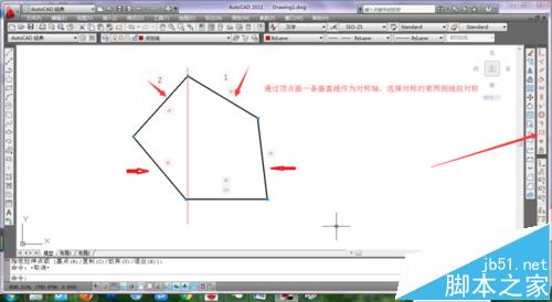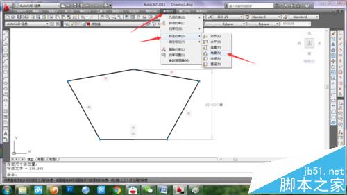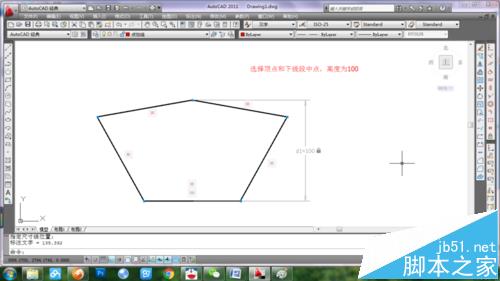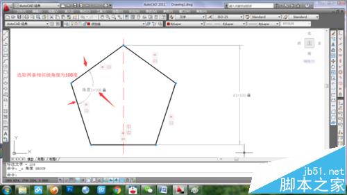 4、點擊參數/標注約束/豎直,選擇頂點和下水平線中點,尺寸輸入100,剛圖形高度縮放到100。然后選擇參數/標注約束/角度,任意選擇兩條相鄰邊線,輸入角度為108(五邊形的內角均為108度)。尺寸約束完成