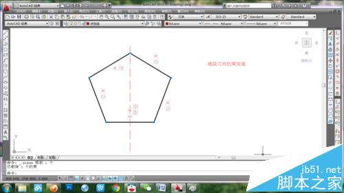 3、切換到中心線層(圖層的設計可以查看下面的引用連接),通過頂點畫一條垂直線,選擇幾何約束工具條中的對稱或者點擊參數/幾何約束/對稱命令,分別選中上面兩條對稱線和下面兩條對稱線,以剛畫的中心線為對稱軸。再選擇約束工具條的水平,對底下的線段進行水平約束。幾何約束完成效果如圖