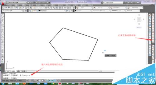 1、可以先把約束工具條提出來,在工具條空白處點右鍵,選擇AutoCAD下的幾何約束前打勾。然后用直線命令畫一個五邊形,點擊幾何約束工具條上的相等或參數/幾何約束/相等,輸入M,選擇五條邊線,對繪制的五條邊進行約束相等。