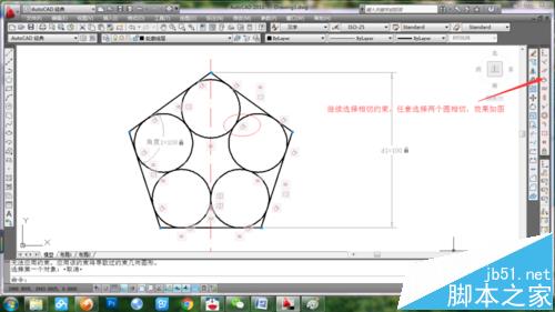 5、在五邊形內任意繪制五個圓,按前面的方法,先對幾個圓約束為相等。再選擇約束工具條中的相切,分別選中圓和相鄰的兩條邊線,約束為相切,需要多次選擇圓和直線來完成,如圖所示