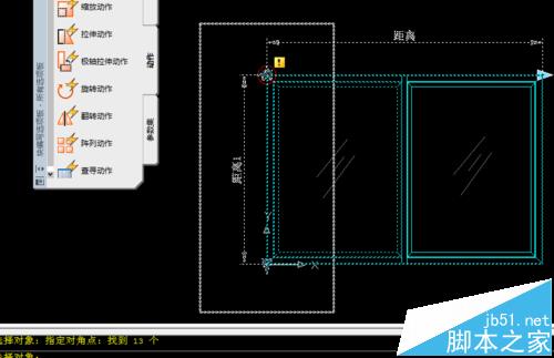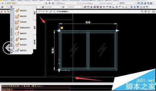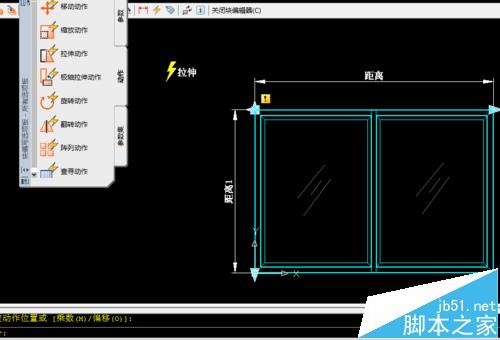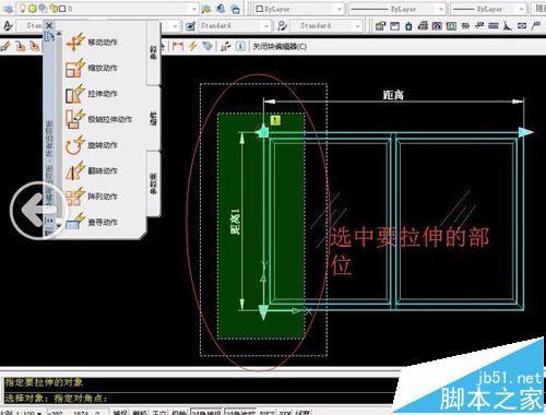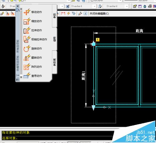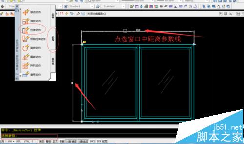 4、在左側塊選項板中點選【動作】中的【拉伸動作】,在窗口的點選要拉伸的距離線,如圖