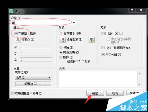 1、我們來制作如圖一個【窗】的拉伸塊,首先制作一個塊名為【窗】的普通塊,如圖步驟