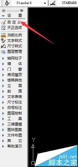 1、首先我們要先設置好天正圖層的快捷鍵,因為天正插件圖層快捷鍵缺少一個【關閉其他】的快捷鍵;操作如圖,我們在天正左側工具條中找到【設置】下的【自定義】
