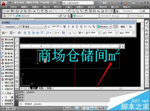 1、這個方式需要在多行文字編輯中才能實現,因此,輸入文字時候使用多行文字,繪圖——文字——多行文字,或者直接在命令欄輸入“mt”,點擊“回車鍵”進入編輯。這里以輸入“平方米”為例,其他的,n次方都是一樣的方式。輸入m^2。
