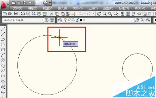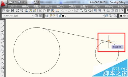 3、選擇cad直線工具,光標放在圓上就會出現切點捕捉,點擊鼠標確認第一點。(要在另一個圓的一側點擊)