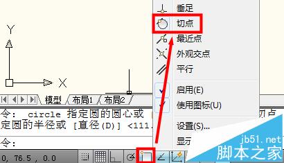 2、右鍵單擊cad對象捕捉,打開cad切點捕捉,同時最好關掉其它捕捉。