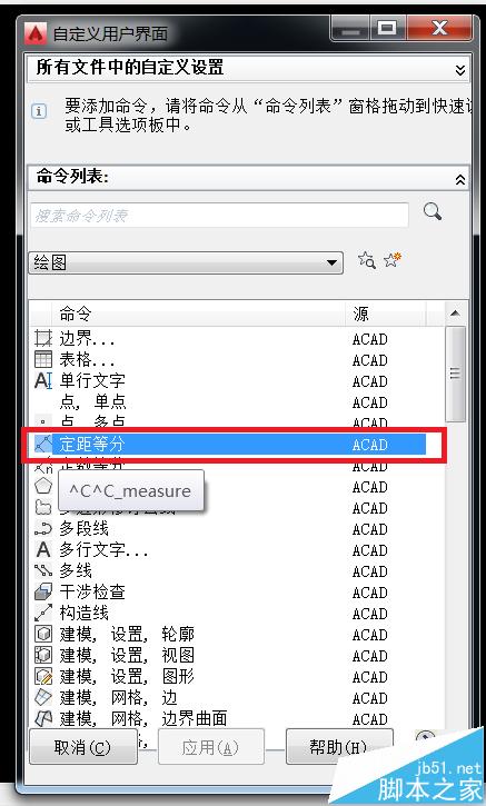 4、以添加定數等分快捷圖標為例,點住定數等分的圖標所在行,