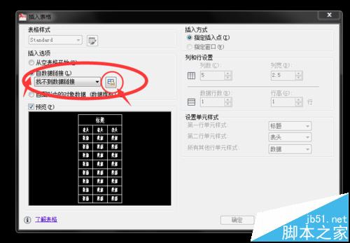 2、打開CAD,在命令欄鍵入table,彈出【插入表格】對(duì)話框 鉤選【自數(shù)據(jù)鏈接】,并點(diǎn)擊右側(cè)圖標(biāo)