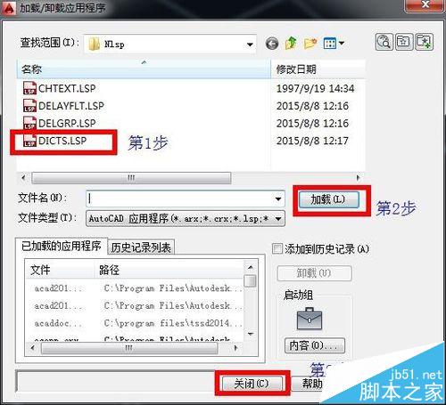 4、然后,我們選擇剛剛下載的 DICTS.LSP文件,點擊“加載”,加載上去后,點擊“關閉”,如圖所示。