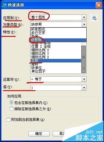 圖上有綠色的線,還有多行文字,還有參照塊,比如我現(xiàn)在要統(tǒng)計(jì)參照塊的數(shù)量,我要設(shè)置一下選項(xiàng)。首先是整個(gè)圖形應(yīng)用到,然后對(duì)象類(lèi)型是參照塊,因?yàn)槲抑缐K的名稱(chēng),所以我選的特性是名稱(chēng),當(dāng)然你也可以選擇別的特性,條件是這個(gè)特性是這個(gè)塊特有的。我的塊的名稱(chēng)是1,然后點(diǎn)擊確定。