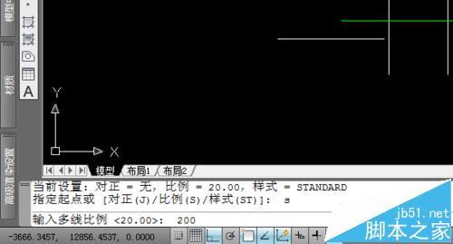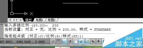 3、當(dāng)我們輸入“ml”回車之后,按照命令行的提示,輸入“j”回車,這是對正。然后再輸入“z”回車,然后是輸入“s“回車,這時(shí)候它讓我們輸入多線比例,如第一幅圖所示。一般墻線都是240的,但是我們在這里用200的就可以,輸入“200”回車就讓我們指定起點(diǎn)了,如第二幅圖所示。