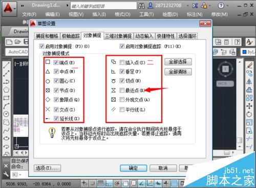 3、進入“對象捕捉”選項卡,如果不是進入的這個,點擊上面的“對象捕捉”就可以進入了。這里需要做個說明,在左邊的紅色方框中,一般都可勾上,因為這些基本上經常用的捕捉方式,而在右邊的紅色方框需要注意了,為了繪圖精確,有個設置“最近點”除非是在某些特殊需要下,來這里勾上,一般不建議勾上,其他的捕捉方式根據自己需要勾上即可。